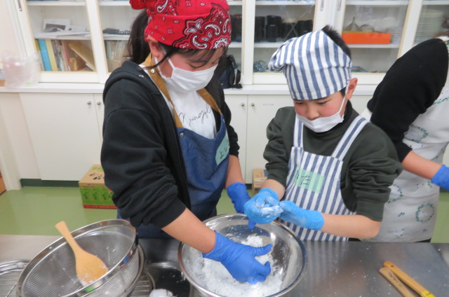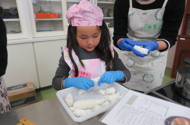最後にやまんば汁に入れる団子を作ります。炊いたお米に片栗粉をまぶして団子状にしていきます。片栗粉を混ぜることで団子の表面がコーティングされ、さらにお米同士の繋ぎになるため、団子がボロボロになるのを防いでくれます。