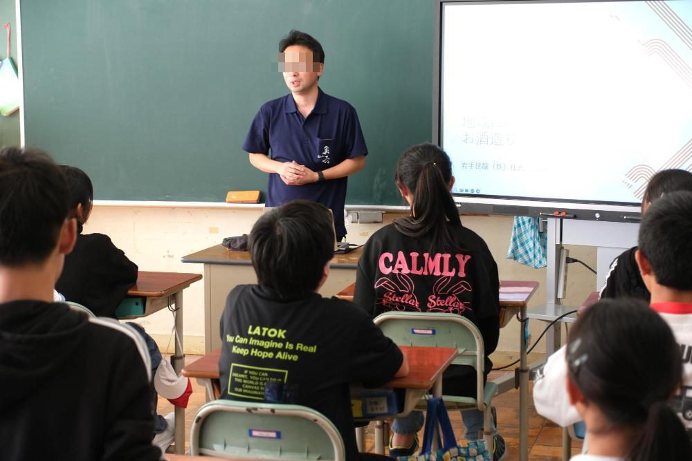 6年生が、働くことについて学びました。衣里小出身で、酒造会社で杜氏として活躍している先輩のお話を聞きました。