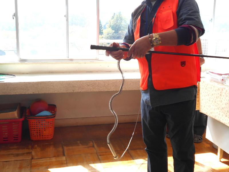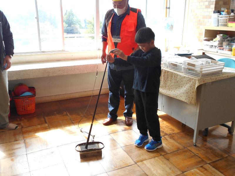 イノシシによる被害や他の野生動物の生態などを学んだあと、イノシシを捕獲するためのわなの仕掛けについて教えてもらいました。