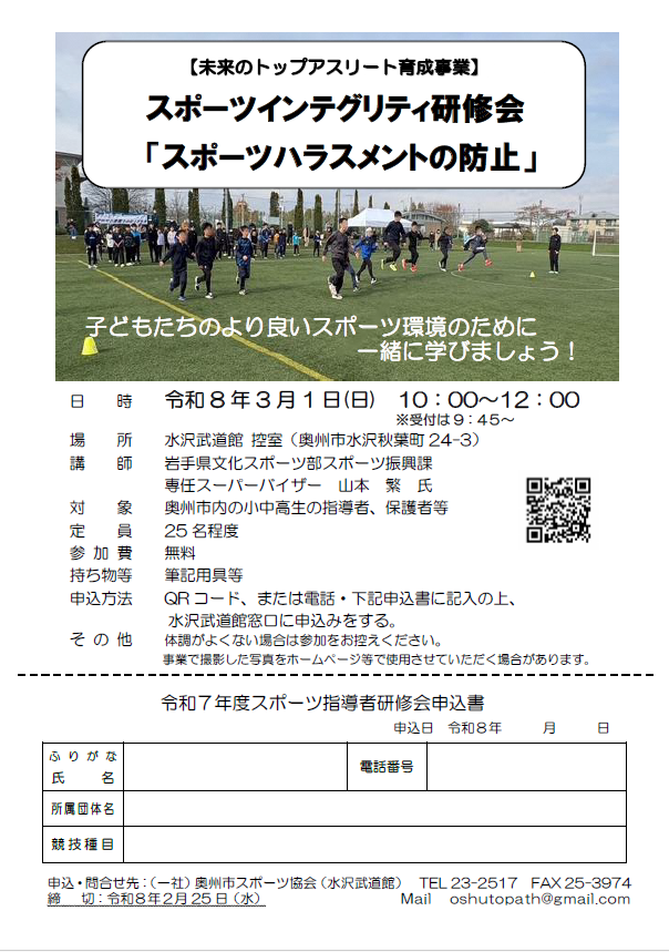 未来のトップアスリート育成事業として、スポーツインテグリティ研修会「スポーツハラスメントの防止」を開催します。