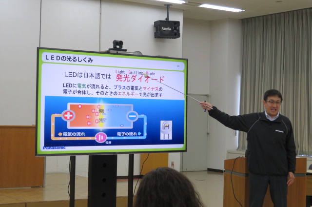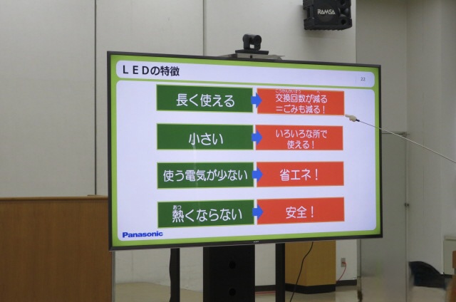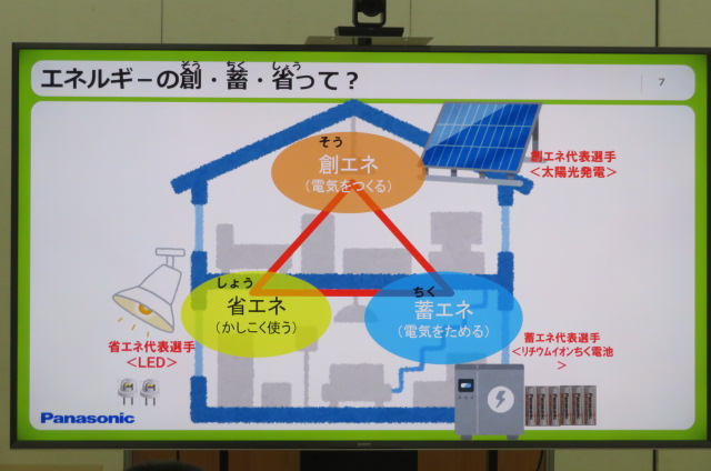 また、太陽光発電による「創エネ(電気をつくる)」、蓄電池による「蓄エネ(電気をためる)」、LED照明による「省エネ(かしこく使う)」の役割についても説明がありました。