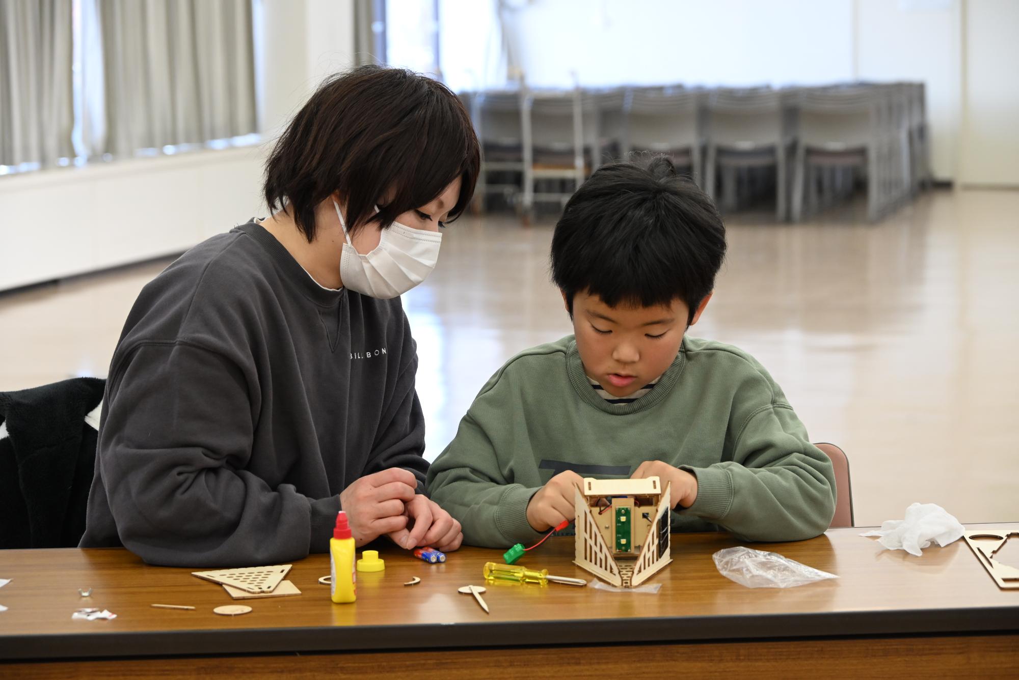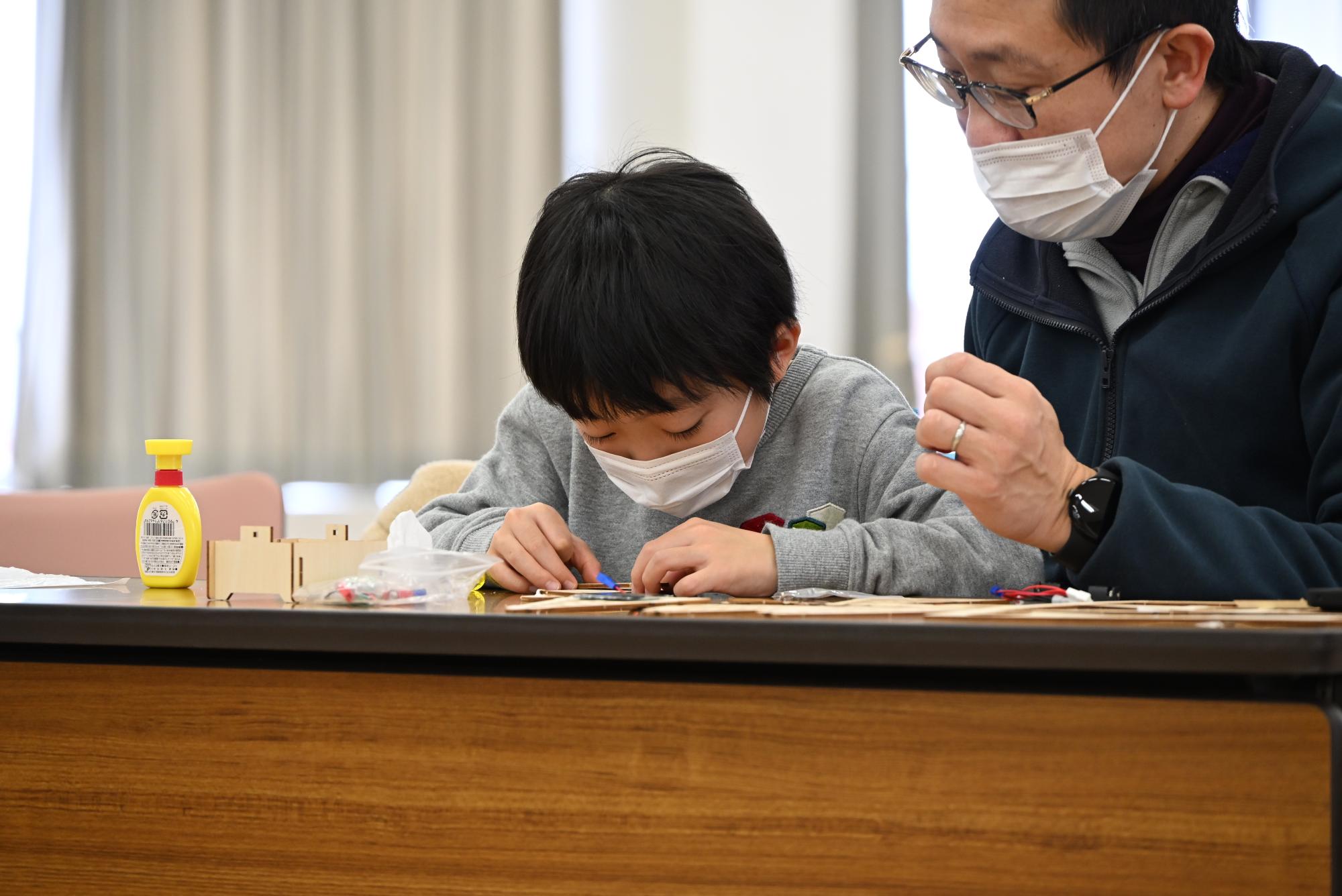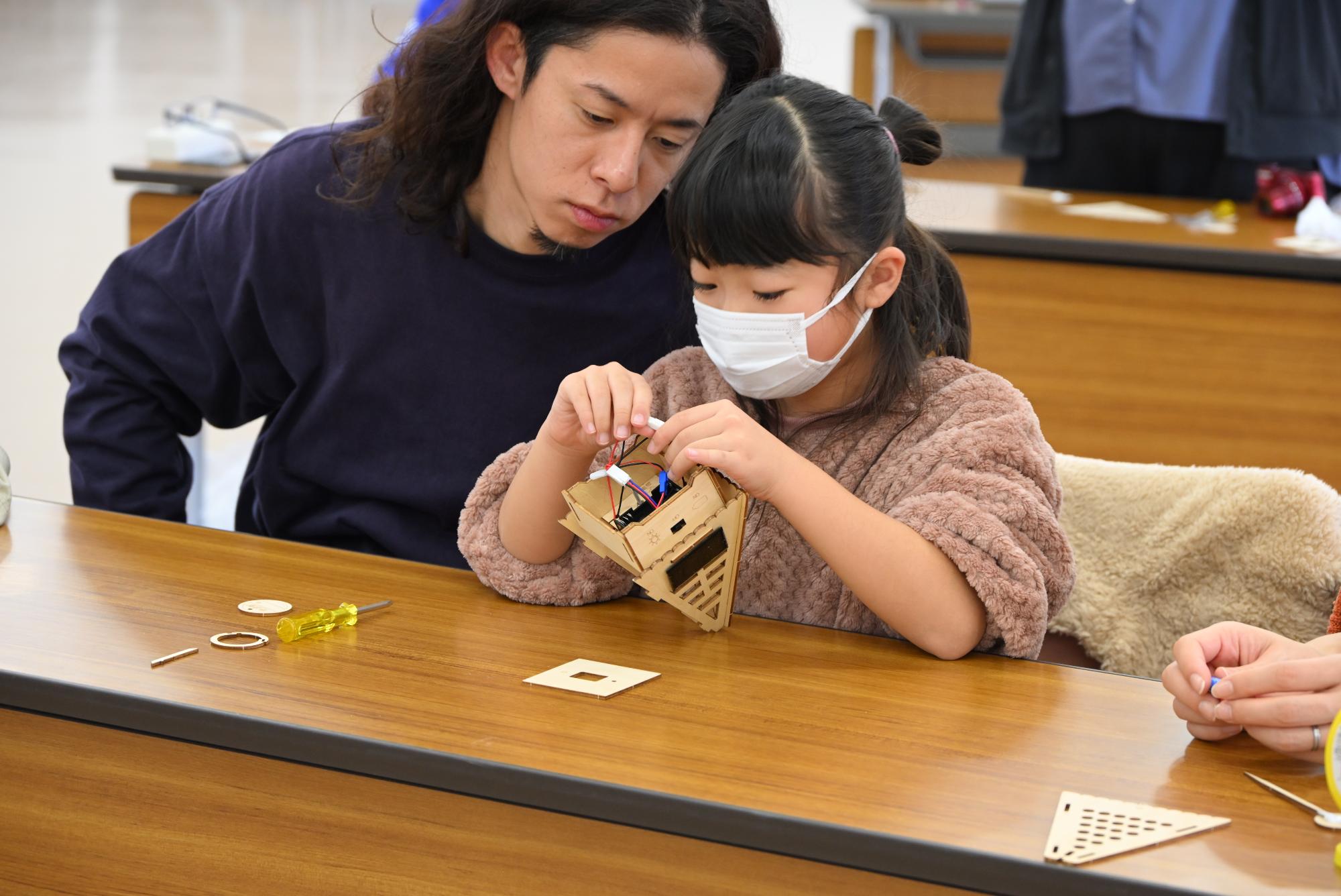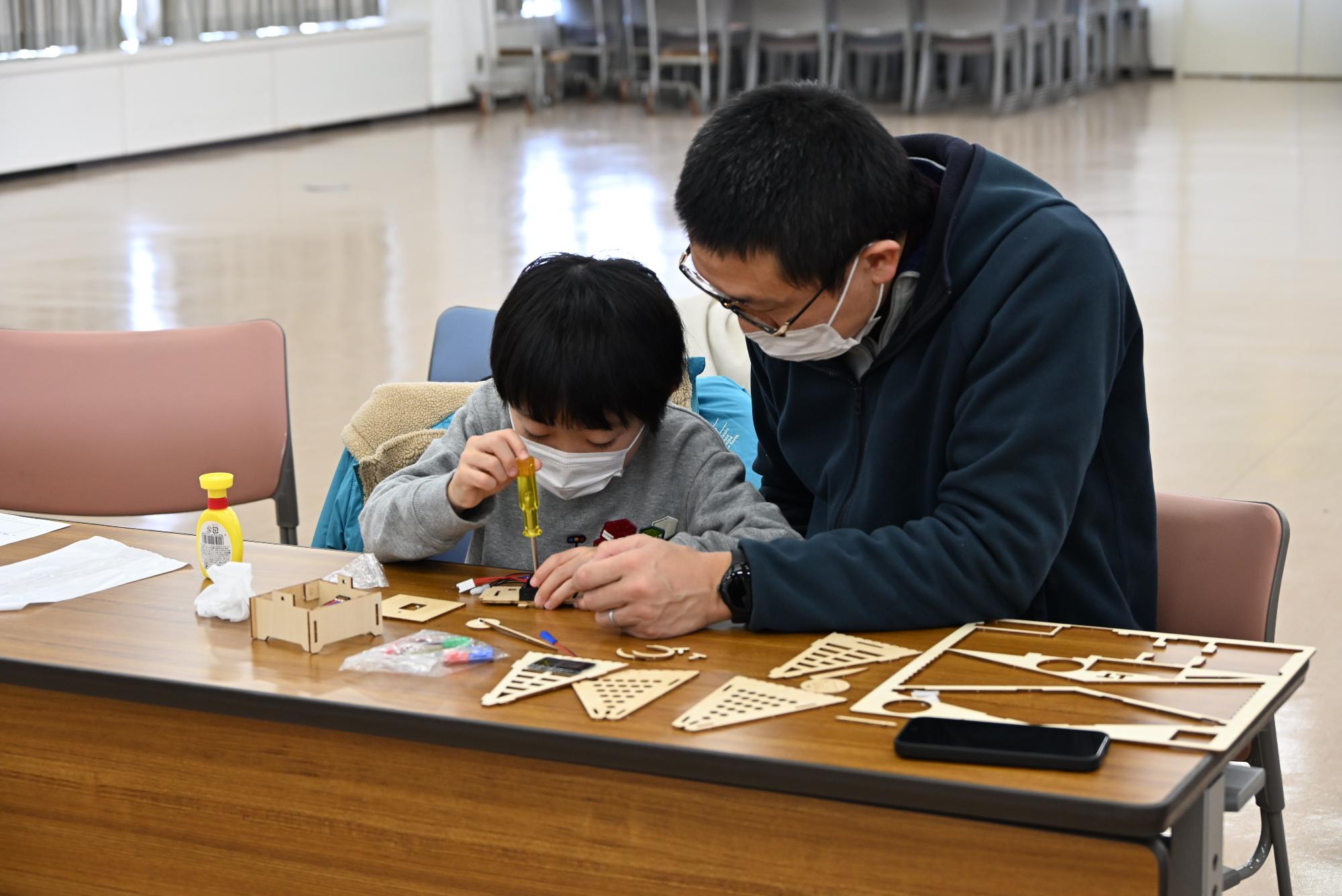 続いて、土台づくりやスイッチ・電池ケースの取り付けを行い、親子で協力しながら作業を進めました。
