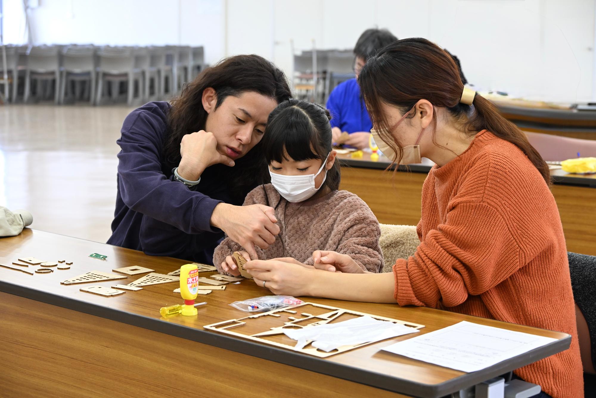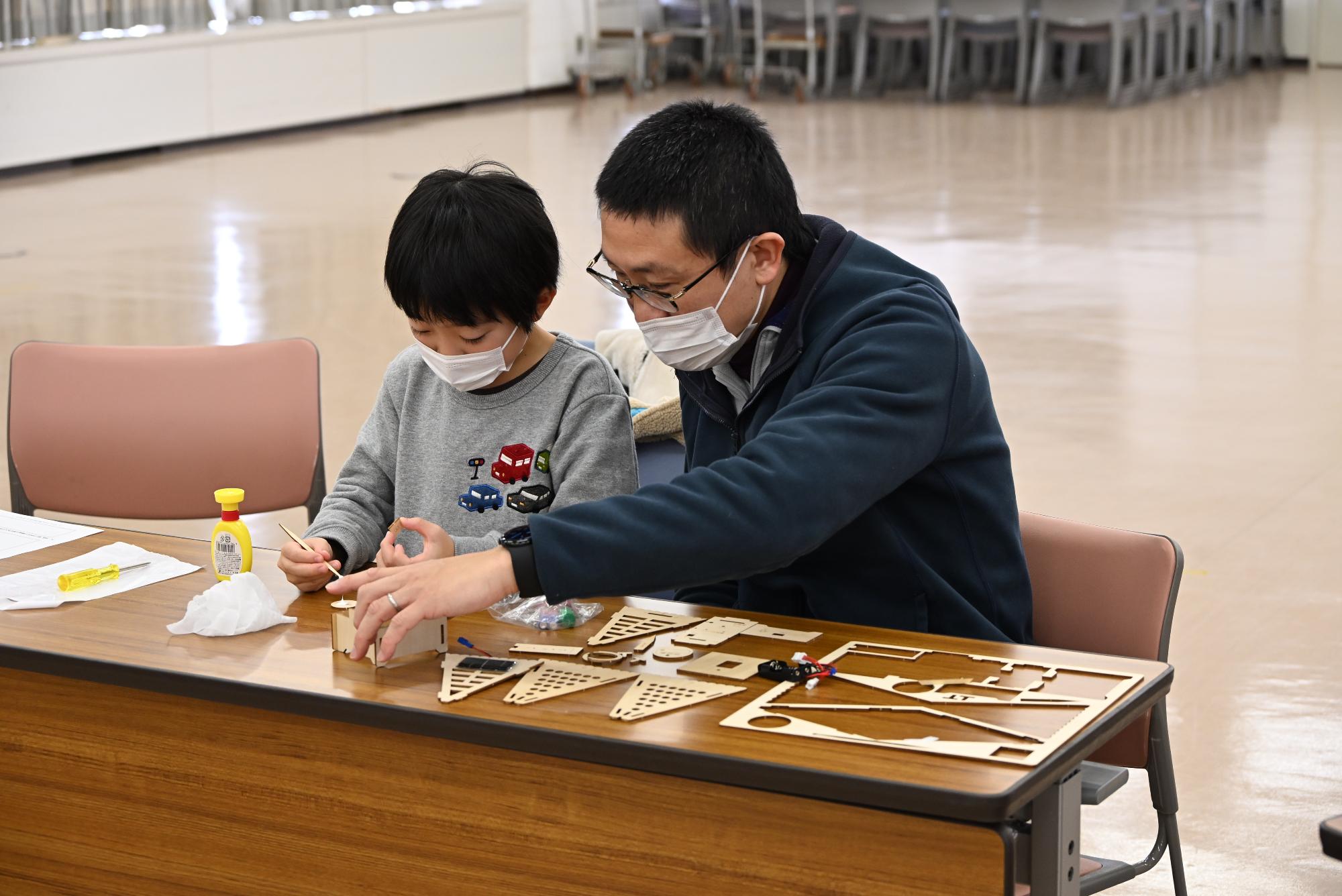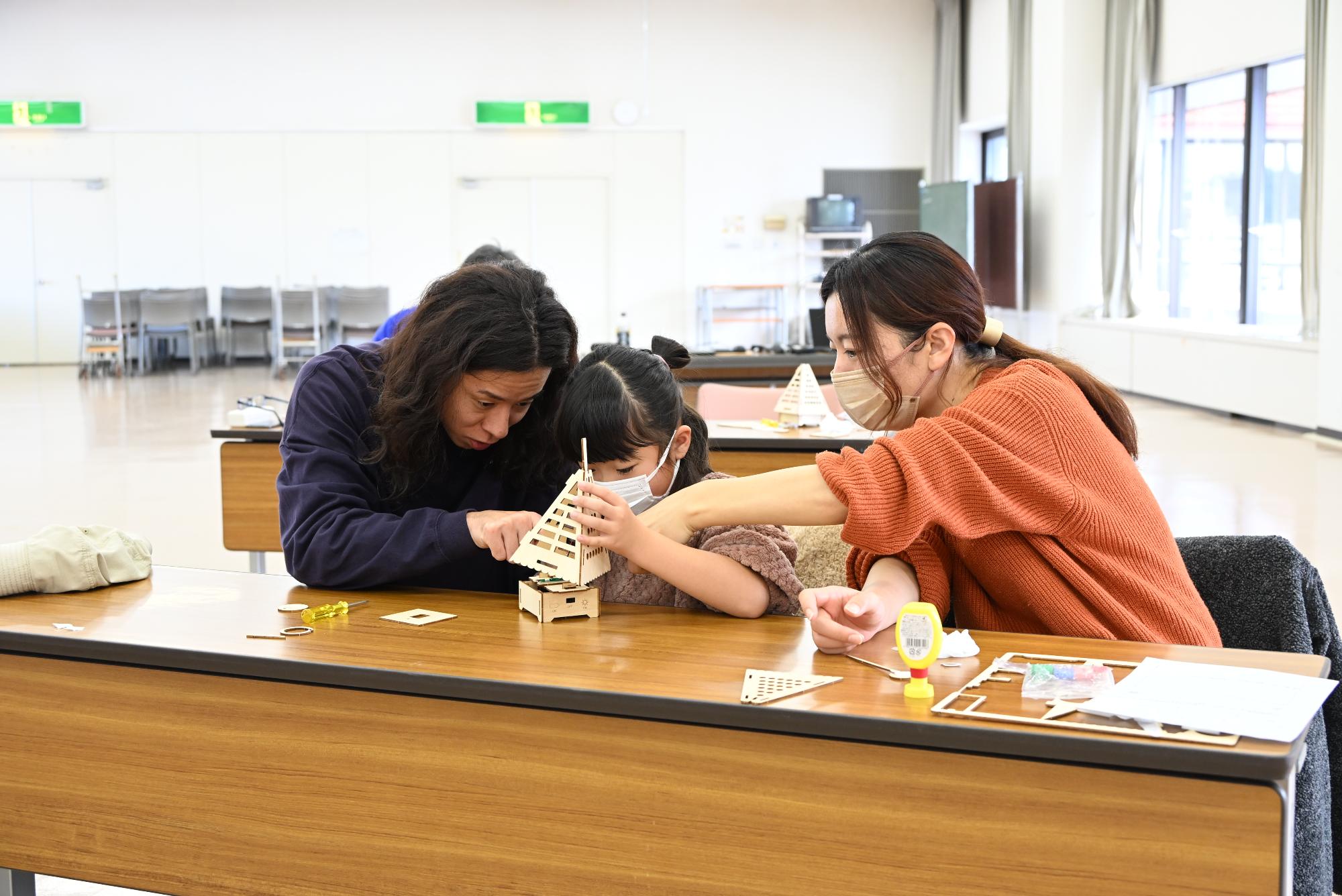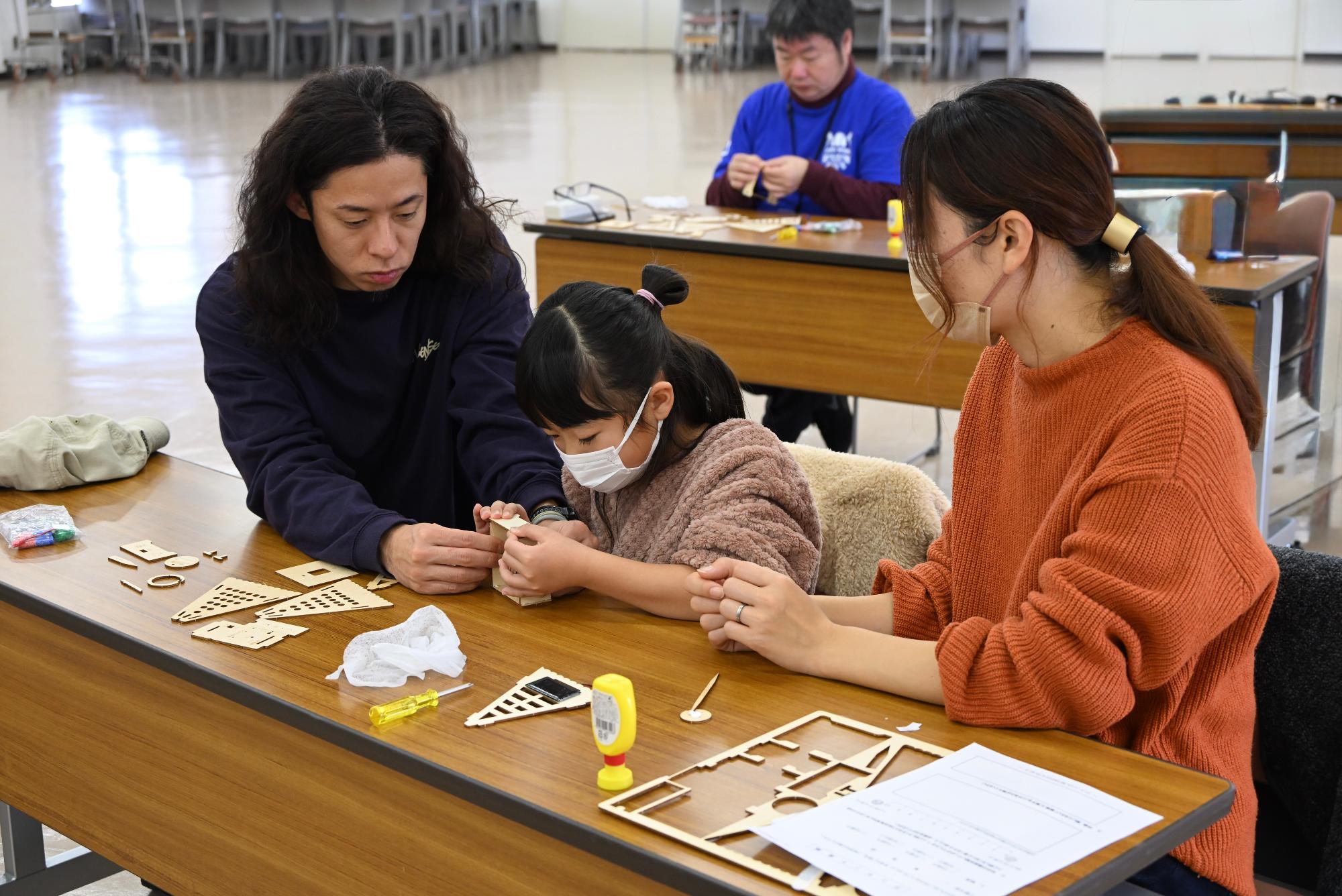 続いて、土台づくりやスイッチ・電池ケースの取り付けを行い、親子で協力しながら作業を進めました。