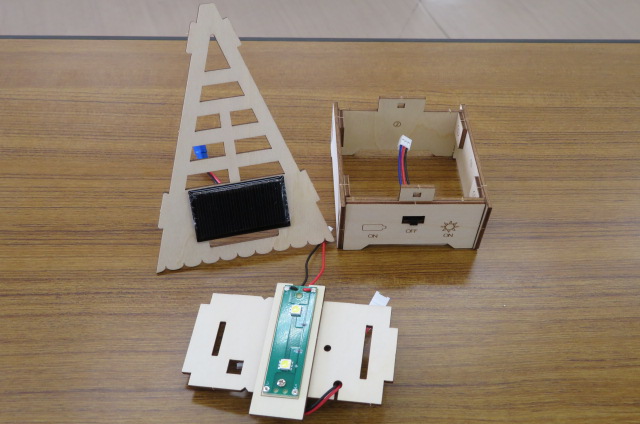 本体を組み立てた後は、ソーラーパネル・乾電池・蓄電池の配線を色ごとにつなぎます。